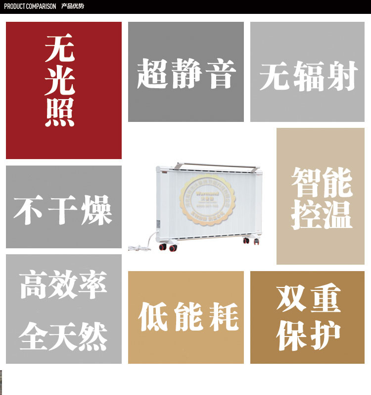 優(yōu)勢二:舒適!碳晶遠(yuǎn)紅外電暖器使用中無“小太陽”光照污染問題,無空調(diào)或者熱風(fēng)機(jī)噪音、揚(yáng)塵問題。