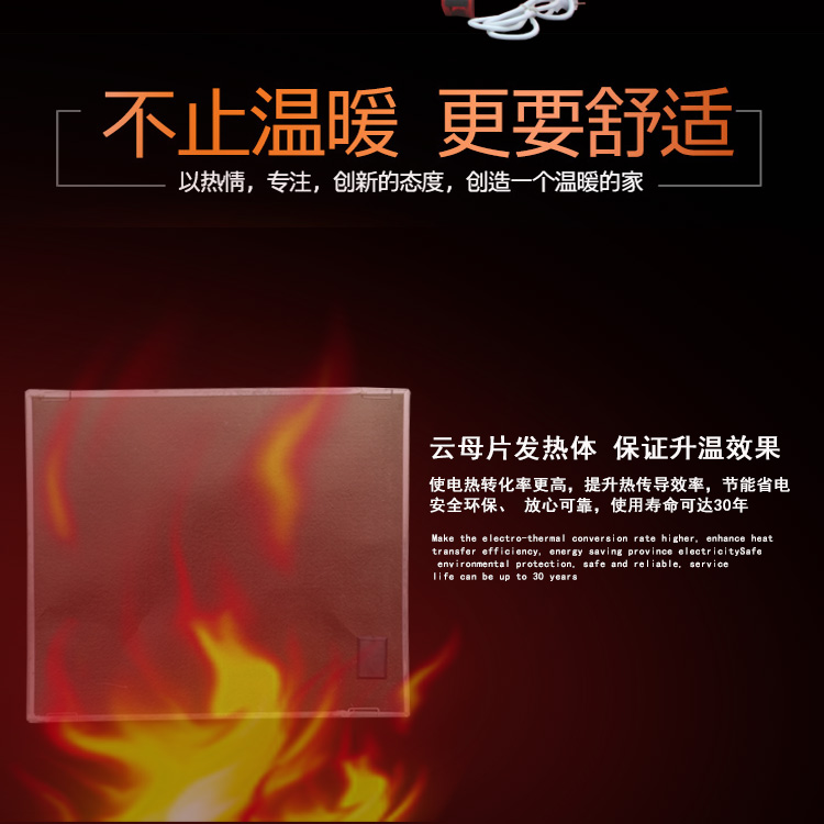 堅(jiān)固耐用,不易損壞,使用壽命長(zhǎng)達(dá)20-30年。產(chǎn)品的零部件和整機(jī)均經(jīng)嚴(yán)格篩選、老化和檢測(cè),導(dǎo)電強(qiáng)度超過(guò)國(guó)家標(biāo)準(zhǔn)2000V,其碳晶加熱體經(jīng)高壓復(fù)合而成,本產(chǎn)品重量輕、無(wú)污染、結(jié)構(gòu)堅(jiān)固、使用壽命不低于10萬(wàn)小時(shí)。設(shè)有三層溫控 。1發(fā)熱體設(shè)有超溫保護(hù)開(kāi)關(guān)。2溫控器設(shè)有散熱體保護(hù)關(guān)3室溫調(diào)節(jié)開(kāi)關(guān)可設(shè)定取暖溫度的恒溫狀態(tài)。耐電擊強(qiáng)度3000伏以上。絕無(wú)磁波輻射。